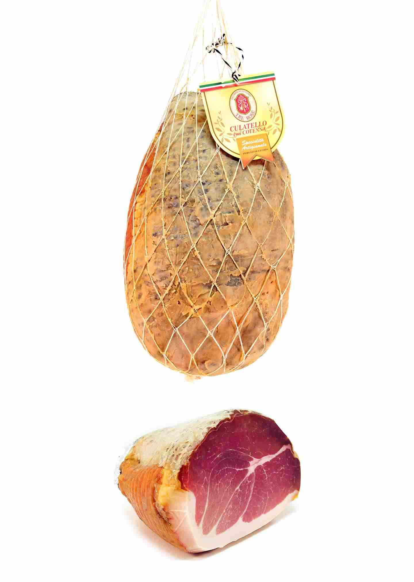 La Culatta con cotenna viene ottenuto dalla parte migliore della coscia e, a differenza del culatello non viene insaccato ma viene lavorato con la sua pelle di protezione esterna (cotenna). La sua stagionatura va dai 16 mesi ai 24 mesi.