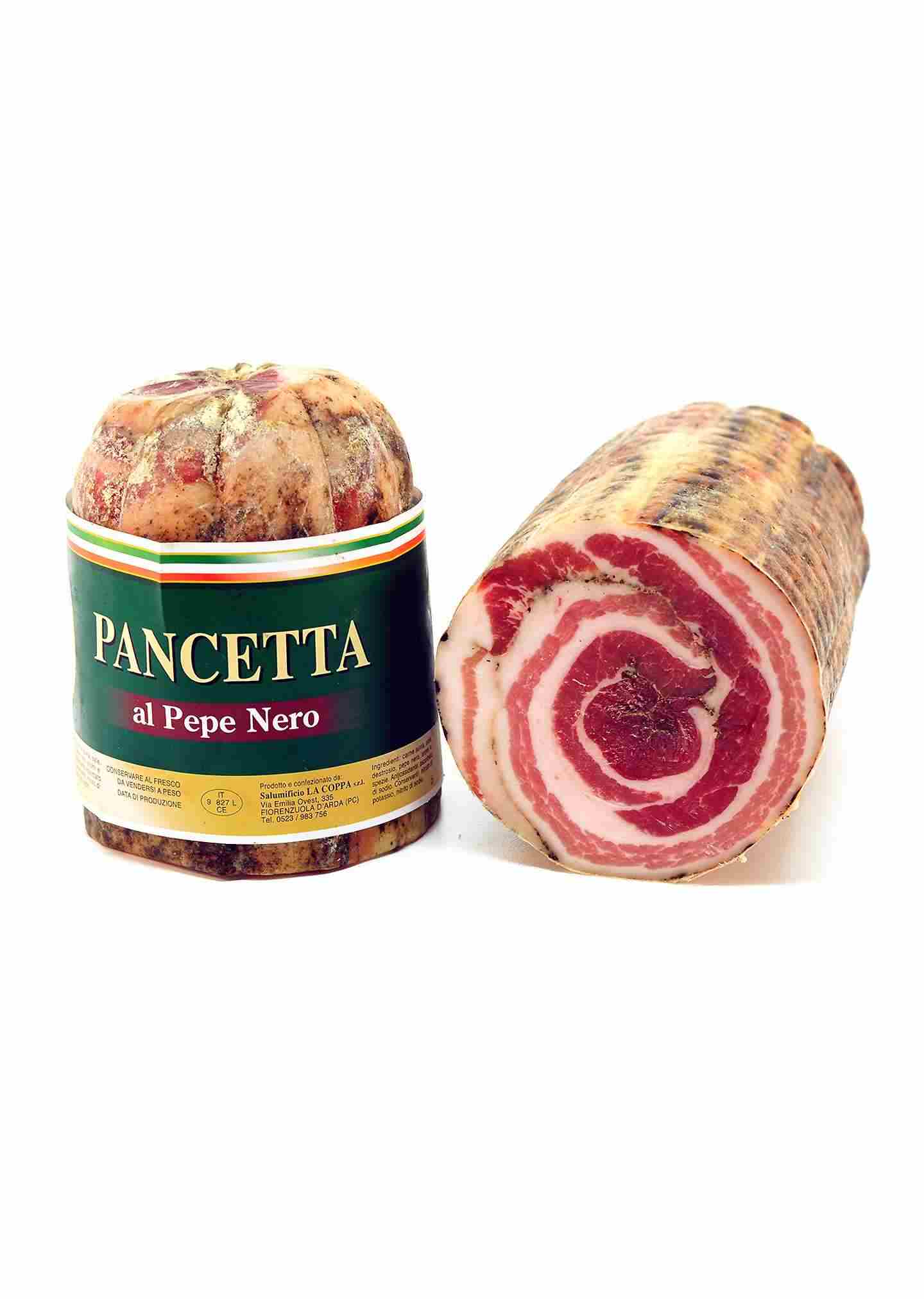 La pancetta al pepe nero, è una pancetta arrotolata senza cotenna che viene aromatizzata con del pepe nero in polvere sia all'interno che all'esterno di essa. Il suo gusto è caratteristico e saporito.