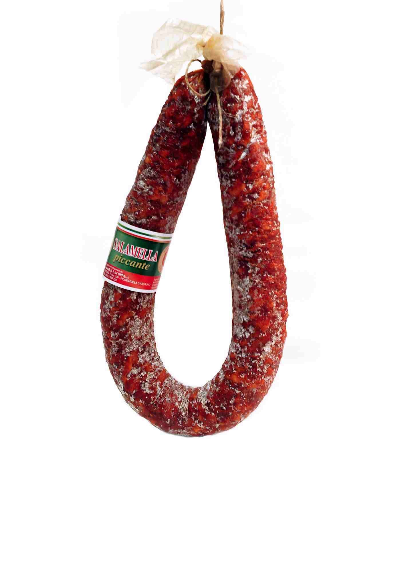 L'impasto della salamella piccante, è uguale a quello dei salametti mignon con l'aggiunta del peperoncino, e viene realizzata a forma di ferro di cavallo.